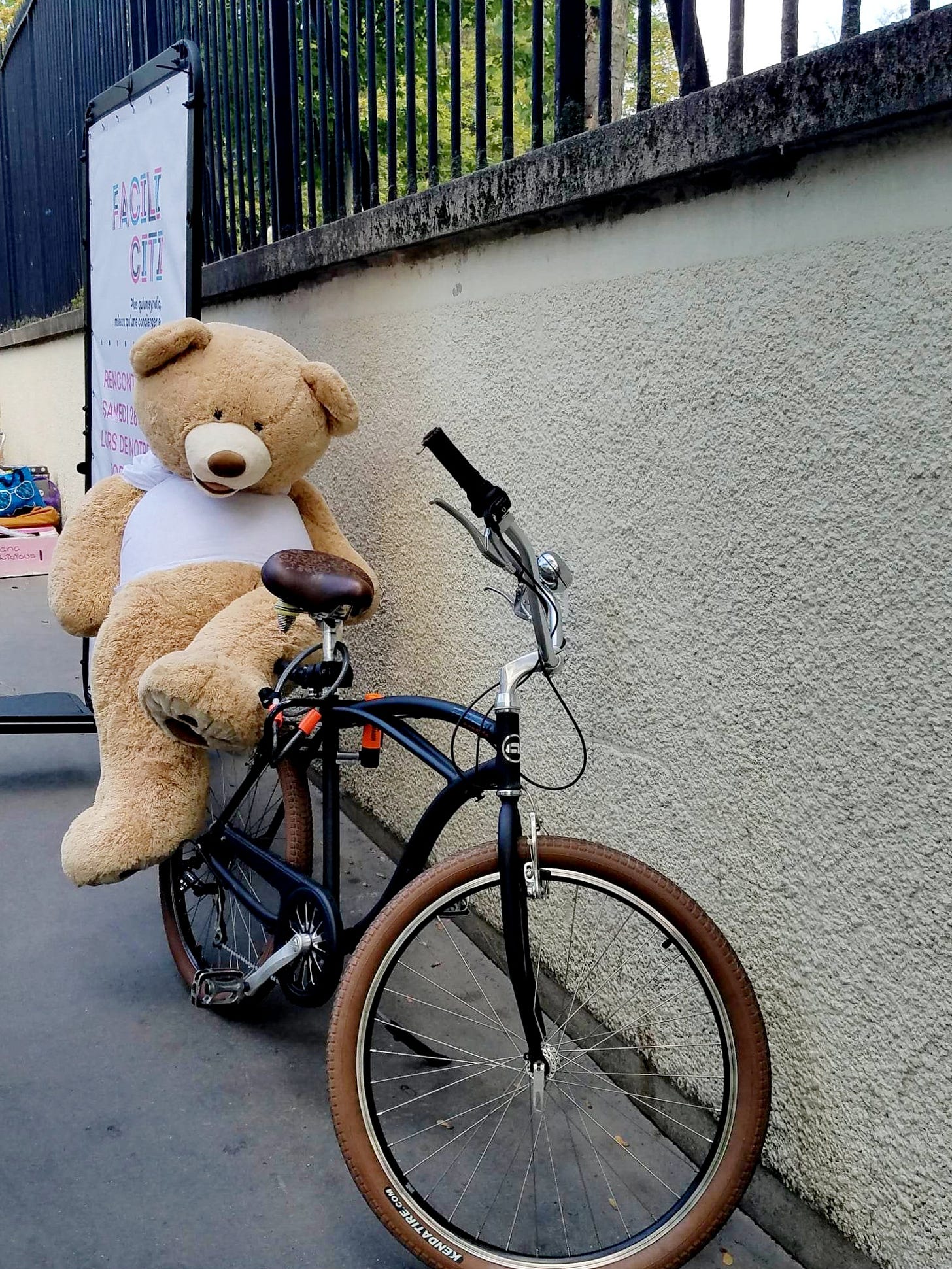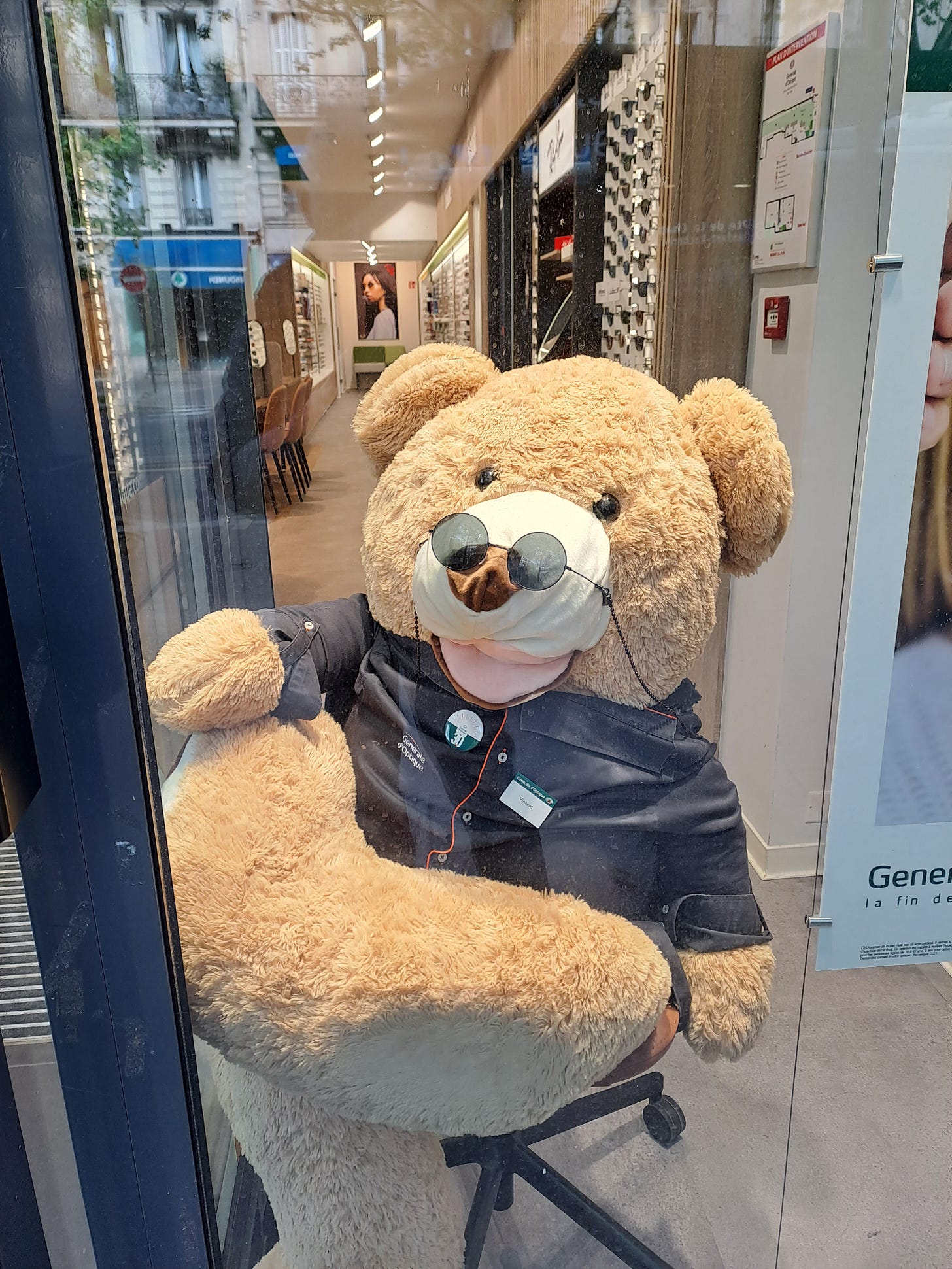 Shortly thereafter, these stuffed animals roughly four feet tall started to appear everywhere in the 13th arrondisement. The Harley bear with a leather jacket on a motorcycle, the ophthalmologist bear at the eyeglass shop, it seemed like most everyone had a bear. Or two. Or five. But why?